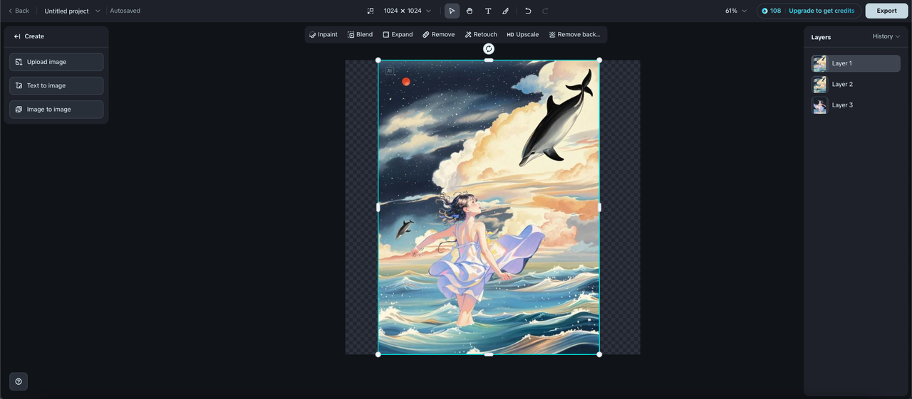 - Leistungsstarke KI-Inpainting: Mit diesem Tool können Sie Bilder auf der Grundlage von Textaufforderungen teilweise neu zeichnen. Es fügt auf intelligente Weise neue Elemente hinzu oder verändert bestehende Teile Ihrer Fotos. 2