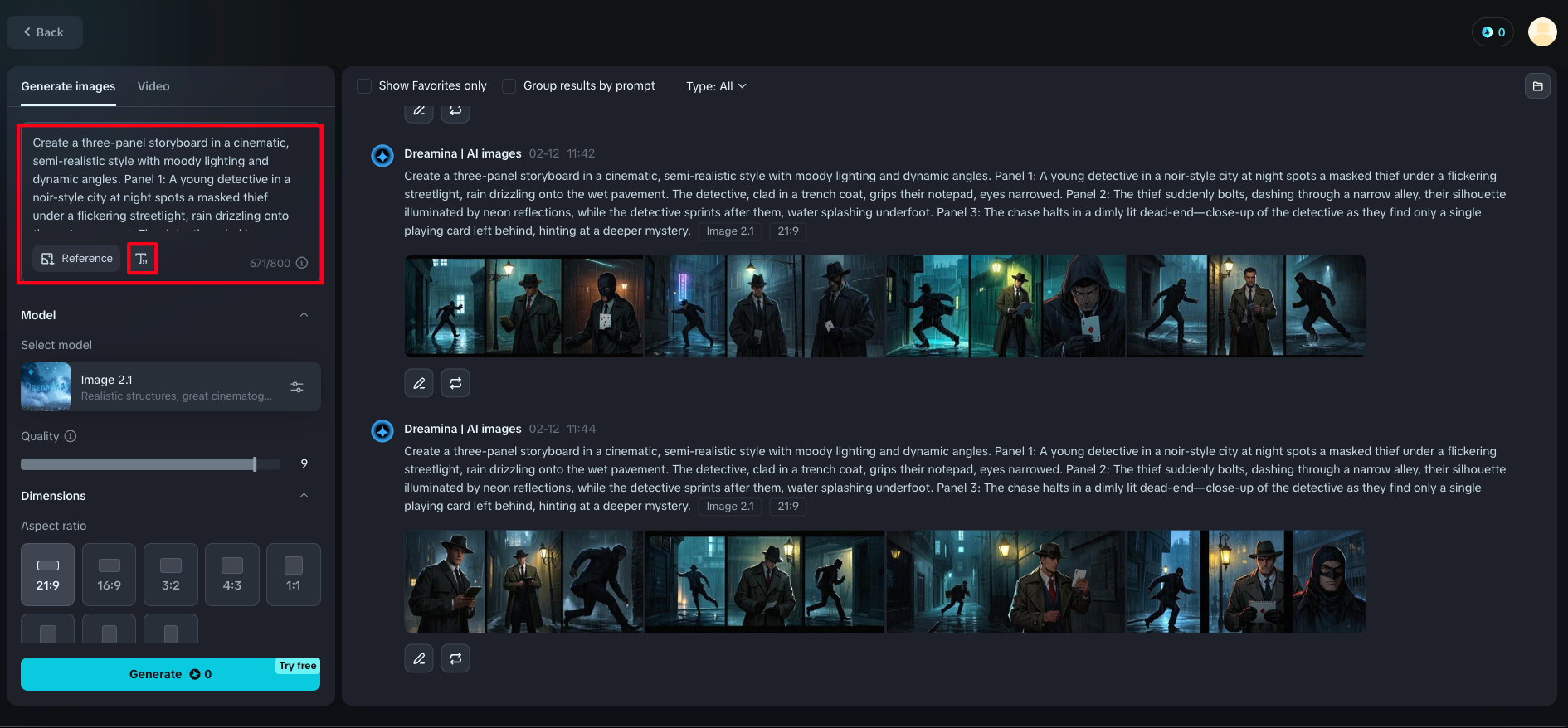 Una vez que hayas iniciado sesión, haz clic en "Generar" para entrar en el creador del storyboard de Dreamina. En el panel izquierdo, encontrarás un cuadro de texto vacío donde puedes describir tu escena en detalle. Incluya elementos importantes como apariencias de personajes, emociones, acciones, ángulos de cámara, iluminación y detalles de configuración. (Utilice el botón "T" para dibujar texto en la imagen generada libremente)