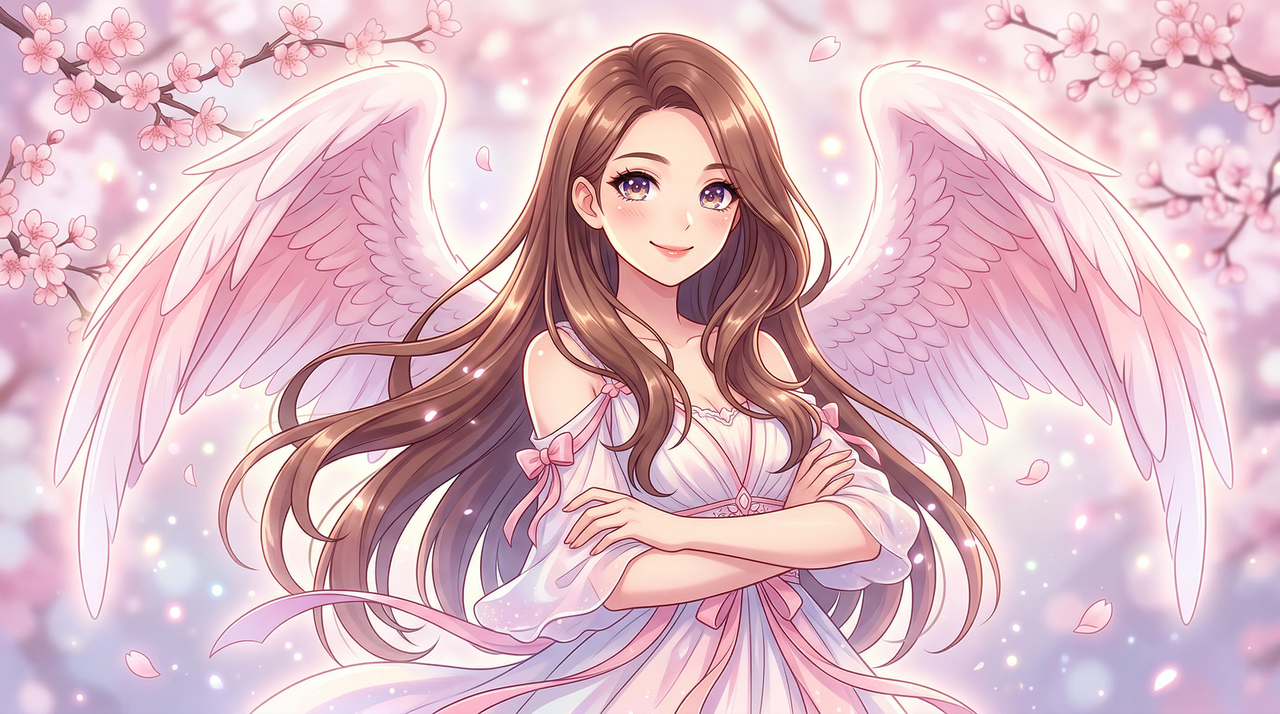 Linda pero poderosa chica ángel estilo anime con alas rosa pastel y blancas, grandes ojos expresivos y flores de cerezo flotando a su alrededor.