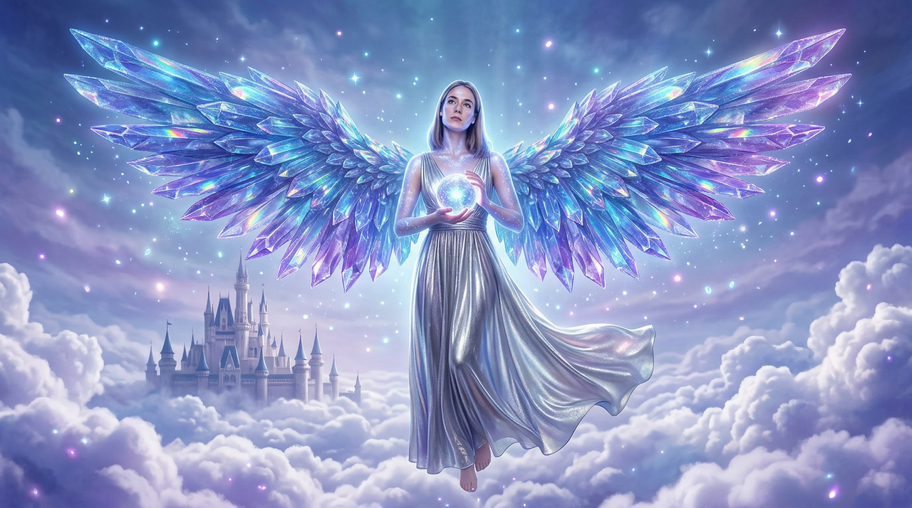 Un ángel majestuoso con alas iridiscentes de cristal en tonos de azul y púrpura, flotando sobre un antiguo castillo en el cielo. Lleva un elegante vestido azul plateado con runas brillantes.