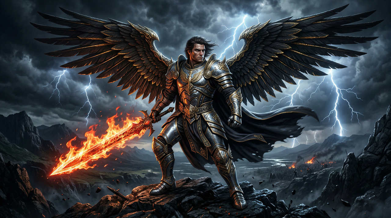 Un poderoso ángel masculino con armadura oscura con alas negras y doradas, sosteniendo una espada en llamas, dramáticas nubes de tormenta al fondo.