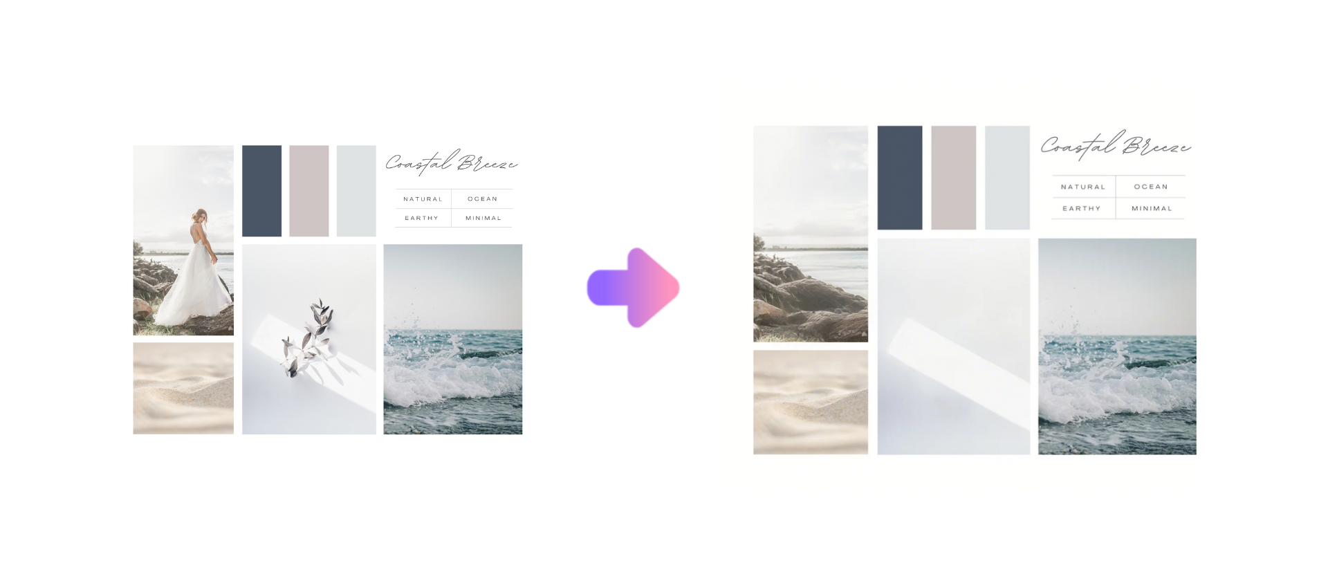 Los tableros de estado de ánimo pueden estar desordenados con fondos de distracción, objetos no deseados o detalles desordenados. La función "Eliminar" te permite borrar las distracciones en segundos, manteniendo el enfoque en lo que realmente importa. Esta herramienta puede transformar una imagen desordenada con elementos innecesarios en un diseño limpio y enfocado que mejora la estética de su tablero. Perfecto para diseño de logotipos, conceptos de interiores y marcas creativas.