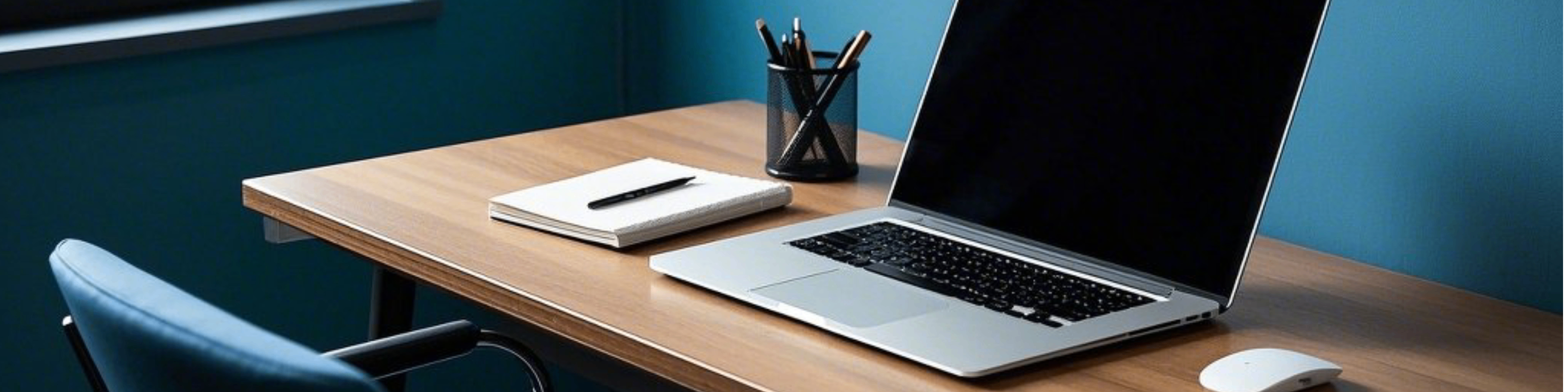 Aviso : Un banner de LinkedIn con una oficina profesional con un escritorio, computadora portátil y computadora portátil, bañada en luz natural.
