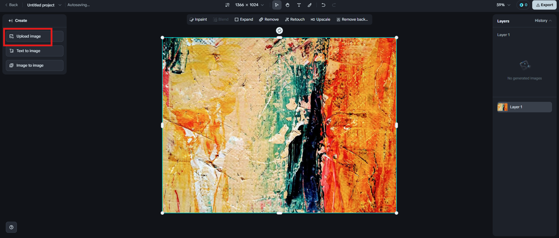 Cliquez sur le bouton "Créer sur le canevas" et sélectionnez "Télécharger l'image" pour importer une photo sur laquelle vous souhaitez ajouter une signature. Cliquez sur "Ajuster au contenu" pour vous assurer que votre photo s'ajuste parfaitement sur la toile.