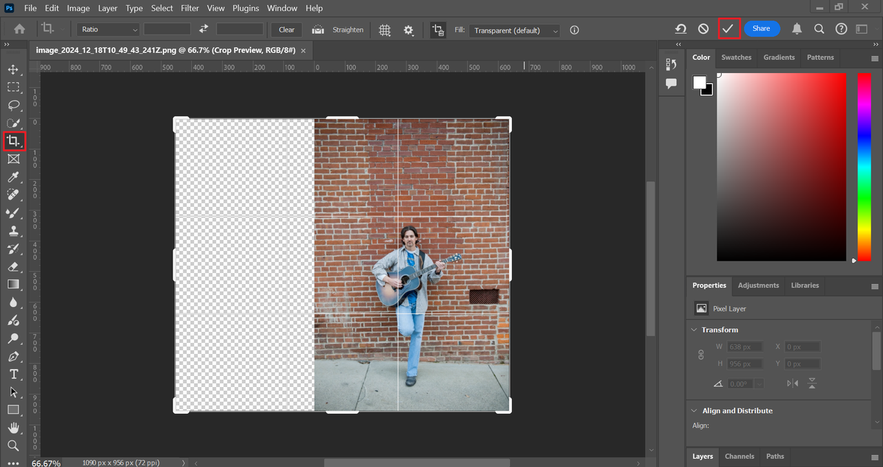 Ensuite, développez votre canevas. Vous pouvez le faire en cliquant sur l'outil de recadrage dans la barre d'outils. Maintenant, faites glisser les bords de votre photo vers la gauche ou la droite pour étendre le canevas vers la gauche ou la droite. Si vous devez développer les deux côtés simultanément, maintenez la touche Alt enfoncée (ou la touche Option sur Mac) et faites glisser les bords vers l'extérieur.