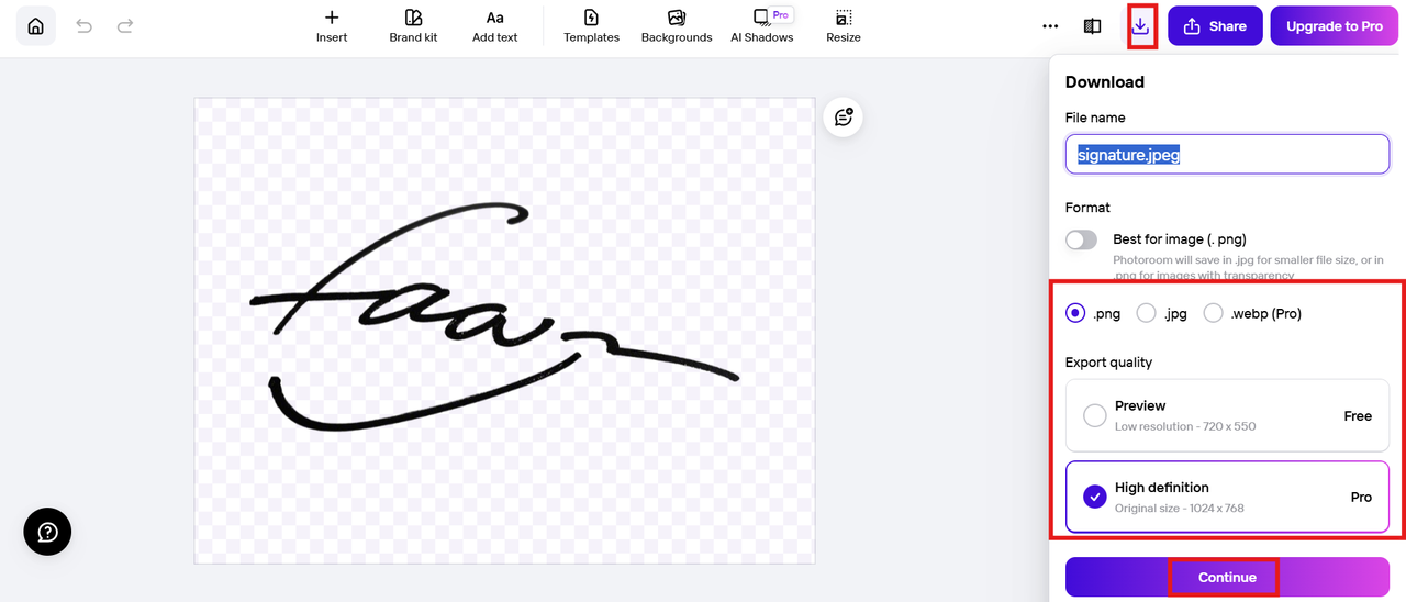 Setelah menyelesaikan pengeditan Anda dan memastikan tanda tangan Anda memenuhi harapan Anda, klik tombol "Unduh," yang diwakili oleh panah bawah di sudut kanan atas. Anda dapat memilih dari berbagai format file (seperti PNG atau JPEG) tergantung pada kebutuhan Anda. Klik "Lanjutkan" dan tanda tangan digital Anda sekarang siap digunakan!