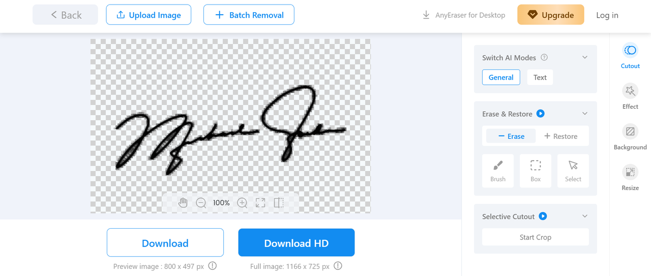 Setelah gambar diunggah, teknologi AI AnyEraser secara otomatis mengenali tanda tangan dan menghapus latar belakang. Anda dapat memilih Mode Umum atau Mode Teks untuk mendapatkan hasil yang diinginkan sesuai gambar Anda. Pengguna dapat mengedit gambar lebih lanjut dengan menggunakan Efek yang berbeda. Anda juga dapat mengubah ukuran gambar Anda untuk hasil yang optimal.