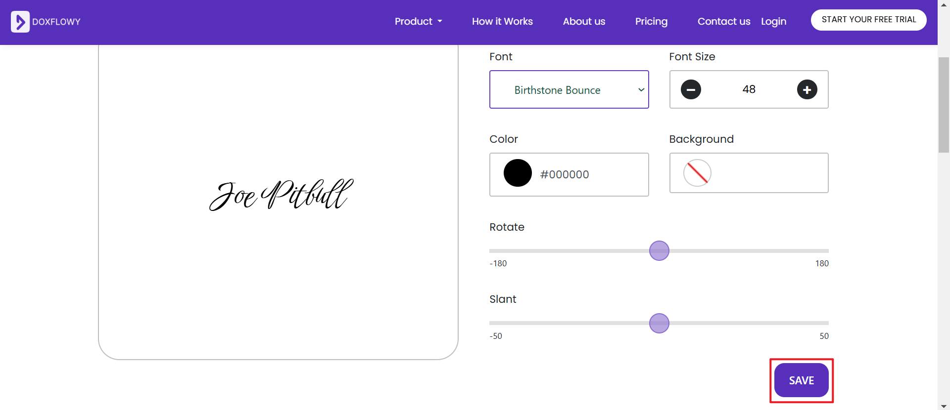 Masukkan nama pilihan Anda di kotak teks dan jelajahi opsi penyesuaian. Anda dapat menyesuaikan gaya font, ukuran, warna, dan latar belakang agar sesuai dengan tampilan yang Anda inginkan. DoxFlowy menawarkan berbagai pengaturan untuk membantu Anda membuat tanda tangan yang sempurna.