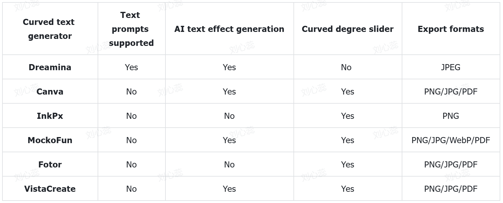 Saat memilih generator teks melengkung terbaik, pertimbangkan fitur apa yang paling penting untuk kebutuhan desain Anda. Beberapa alat unggul dalam petunjuk teks pintar dan efek berbasis AI, sementara yang lain menawarkan slider kelengkungan yang fleksibel dan opsi ekspor yang luas. Di bawah ini adalah perbandingan cepat dari kemampuan utama: