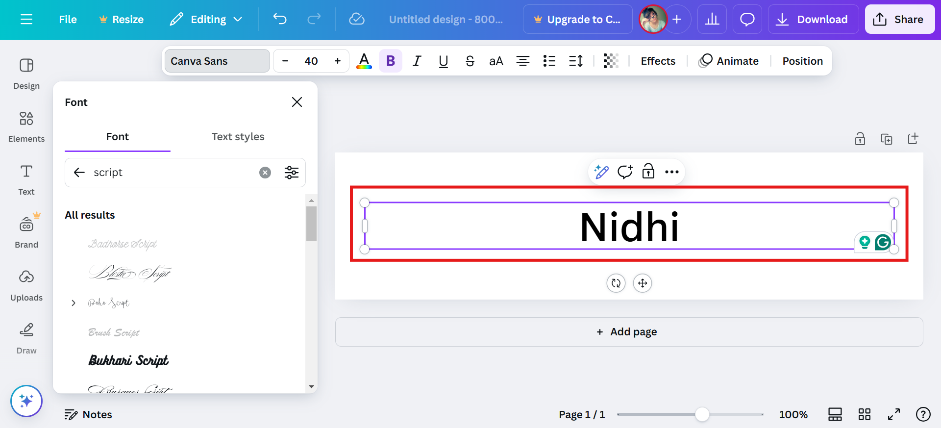Canva menawarkan berbagai macam font untuk dipilih, memungkinkan Anda menyesuaikan gaya dan nuansa tanda tangan Anda. Bereksperimenlah dengan font yang berbeda sampai Anda menemukan font yang paling Anda sukai. Anda dapat menyesuaikan pengaturan lain seperti ukuran, warna, ketebalan, dan latar belakang.