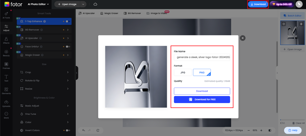 Una volta che la tua foto è ruotata e sei soddisfatto, è il momento di salvare il tuo lavoro. Cerca l'icona Esporta nell'angolo in alto a destra dello schermo. Fai clic su di essa e vedrai le opzioni per personalizzare il formato del file (JPEG o PNG) e le dimensioni. Una volta impostato, scegli l'opzione di esportazione e fai clic sul pulsante "Scarica".