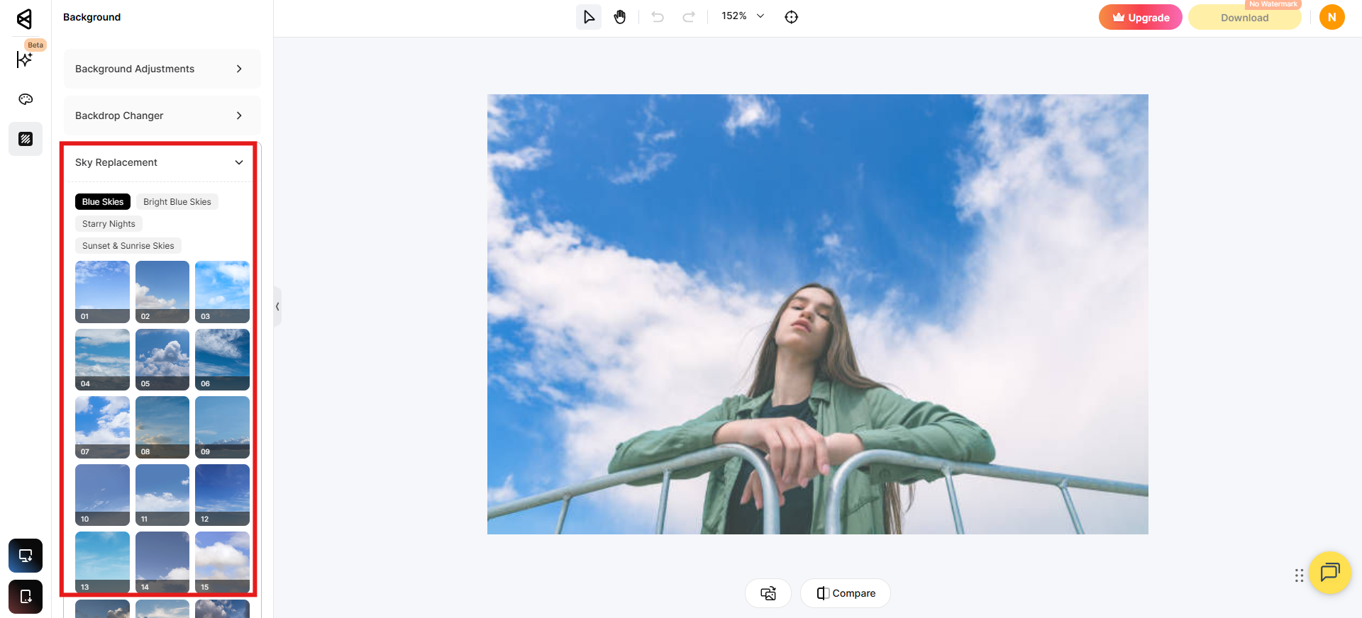 - Rimozione del cielo basata sui livelli: Pixlr utilizza i livelli per separare il primo piano dal cielo, consentendo di aggiungere una nuova immagine del cielo come livello di sfondo mantenendo intatto il soggetto originale. 2