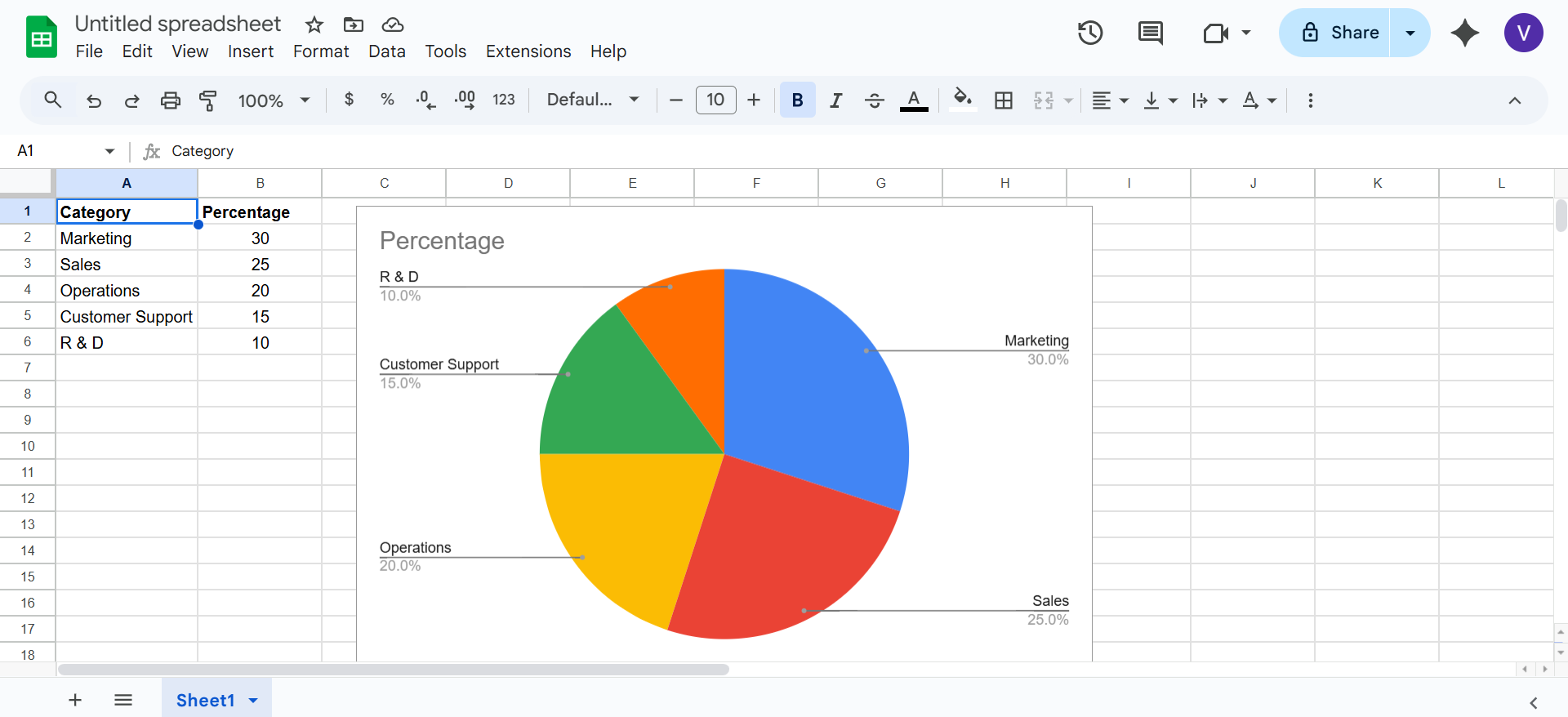 データを定期的に扱うことが好きで、チャートをより制御したい場合は、Googleスプレッドシートは無料で信頼性の高いソリューションです。Googleスプレッドシートは、パーセンテージパイチャートを作成するためのデータ駆動型アプローチを提供するスプレッドシートツールです。このようにすることで、データを表示または管理し、リアルタイムで変更を確認できます(すぐに行われます)。これにより、データ分析に協力するチームや、変化する情報に基づいて定期的に円グラフを更新する必要がある場合に、Googleスプレッドシートが便利になります。