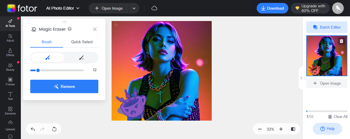 - 正確な除去のためのブラシツール:Fotorは、ユーザーが不要な項目に注意を引くことができますユーザーフレンドリーなブラシツールを提供しています,このようなステッカーや絵文字など.このツールを使用すると,正確な除去は、近くのコンポーネントを損なうことなく保証されています.