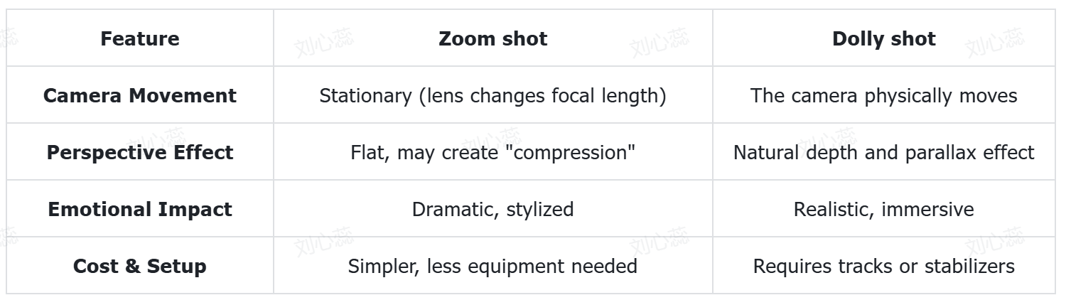 줌 샷은 카메라를 고정한 채 렌즈의 초점 거리를 변경하여 평평하고 압축된 시야를 만듭니다. 드라마틱하고 스타일리시한 효과를 생성하며, 최소한의 장비가 필요하여 짧은 시간 안에 설정하기 쉽습니다. 도리는 카메라를 피사체 쪽으로 또는 멀리 물리적으로 이동시켜 자발적인 3차원성과 3차원 시차를 만듭니다. 스토리텔링 중 감정적 영향을 관리하고 관객의 주의를 끌기 위해 두 가지 방법을 동시에 사용할 수 있습니다.