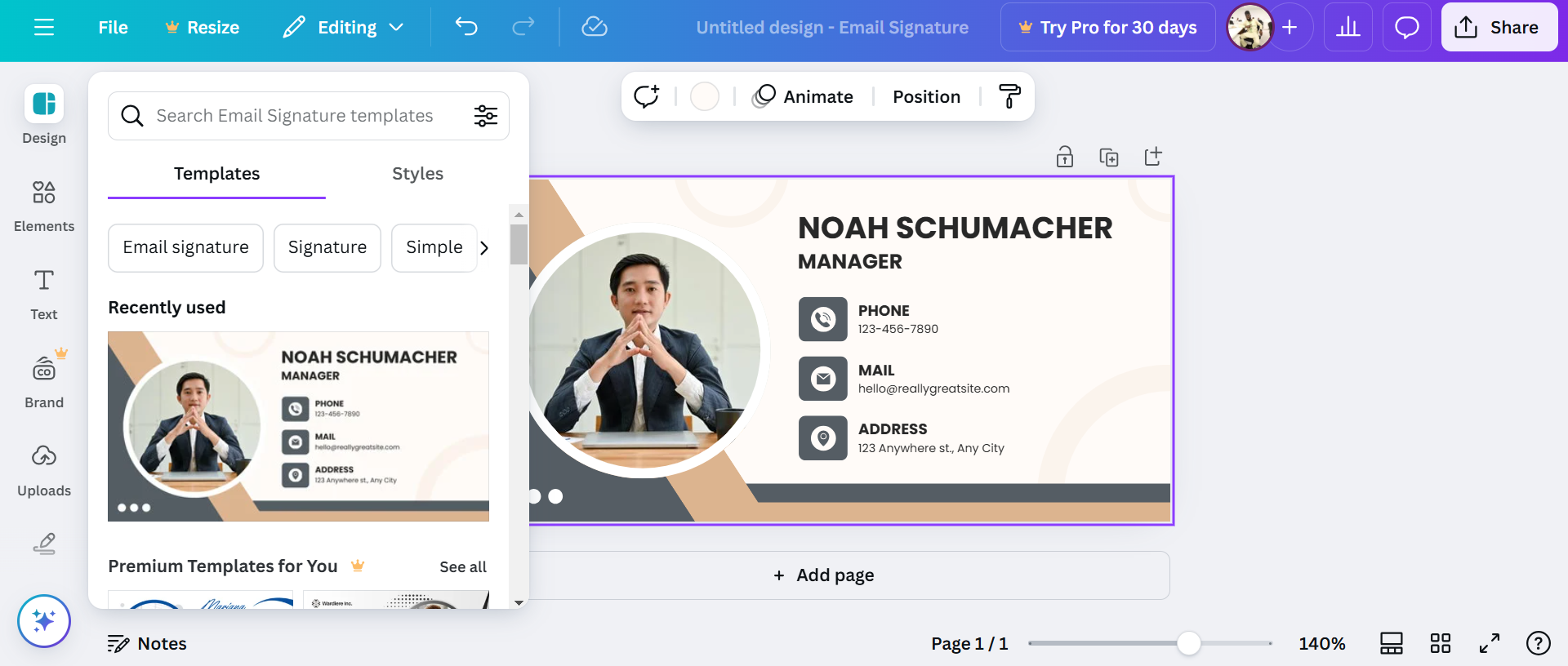 - Drag-and-drop interface: Canva is ontworpen voor beginners. De slepen-en-neerzetten-functionaliteit maakt het gemakkelijk om professionele e-mailhandtekeningen te maken zonder enige ontwerpvaardigheden. U kunt elementen zoals tekst, afbeeldingen, pictogrammen en vormen verplaatsen, verkleinen en aanpassen om de gewenste look te bereiken. 2