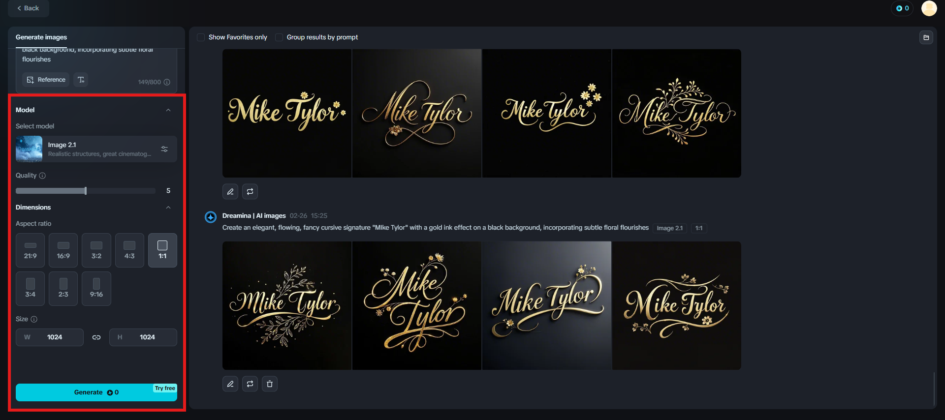 Verfijn vervolgens uw generatie-instellingen. Selecteer een geschikt AI-model (Dreamina biedt er verschillende om uit te kiezen), pas de kwaliteitsinstelling aan voor een optimale resolutie, kies een beeldverhouding die past bij uw kenmerkende stijl en selecteer uw gewenste maat. Als je eenmaal tevreden bent, druk je op de knop "Genereren" en laat Dreamina zijn magie bewerken!