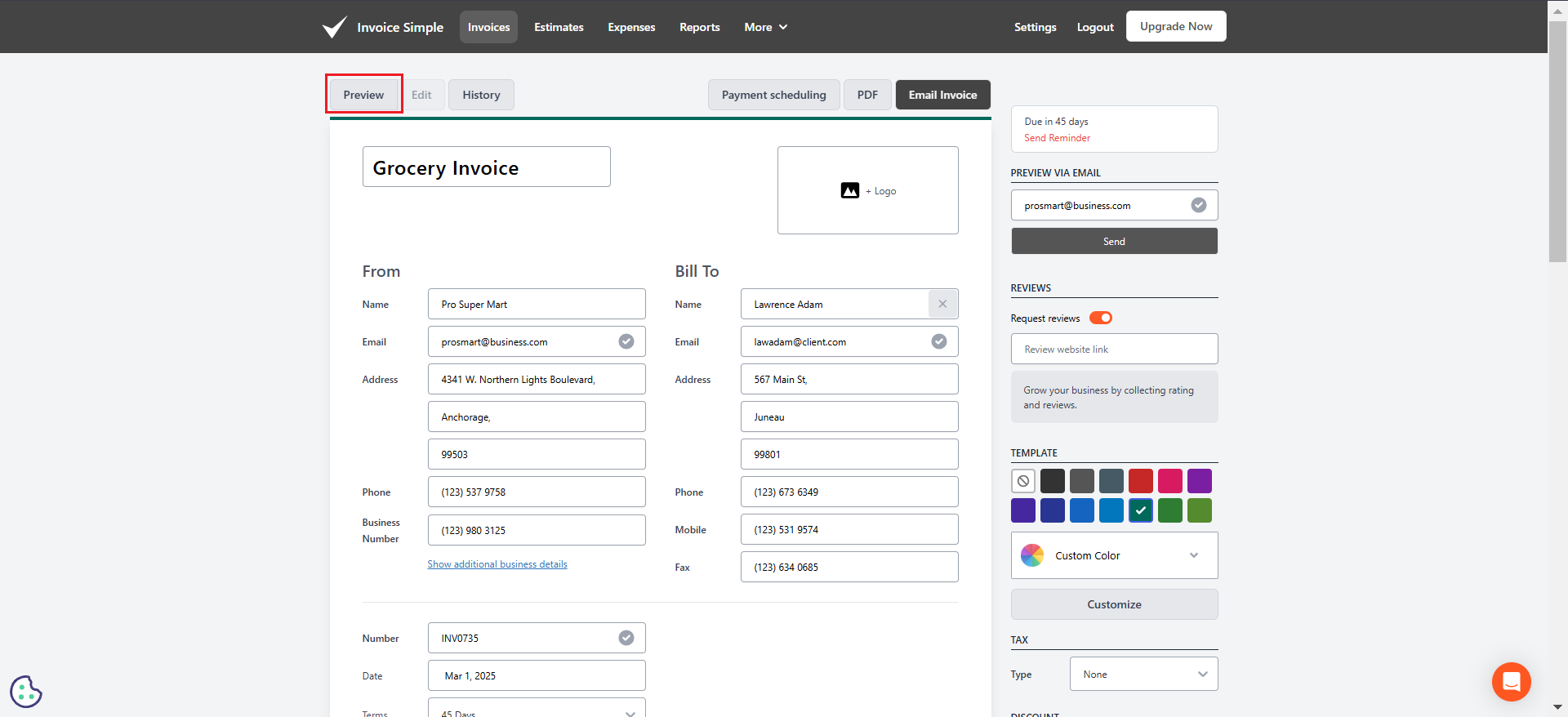 Nadat u de factuurgegevens heeft ingevoerd, klikt u op "Voorbeeld" om de definitieve lay-out te bekijken en ervoor te zorgen dat alle informatie correct is. Stuur na bevestiging de factuur rechtstreeks naar de e-mail van uw klant voor snelle en naadloze facturering.