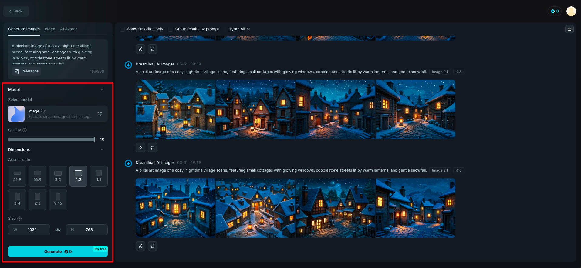 Depois de escrever seu prompt, o próximo passo é definir as configurações de geração de imagem. Primeiro, comece escolhendo um modelo e depois ajuste o controle deslizante de qualidade (para obter os melhores resultados, defina um valor de 10). Em seguida, escolha sua proporção ou digite manualmente a largura e a altura. Quando terminar de ajustar esses parâmetros, clique no botão Gerar.