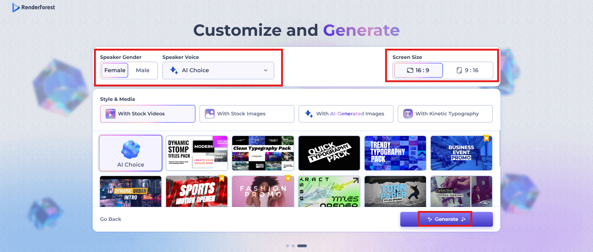 Once you are done with writing prompts, it's time to fine-tune some settings. You can first pick the video style between Animation and Realistic. Thereafter, choose the speaker's gender, voice, and screen size. Finally, click the Generate button and wait for a few seconds until the AI generates the output.