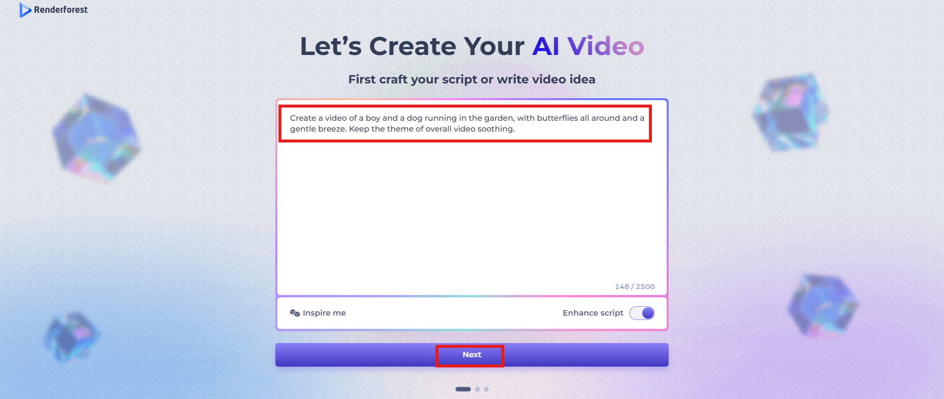 To generate short videos AI free with Renderforest, launch its official website and start writing the prompt in the box. Enter text prompts carefully and be specific with your instructions. The more details you add, the better. Click the Next button to proceed further.