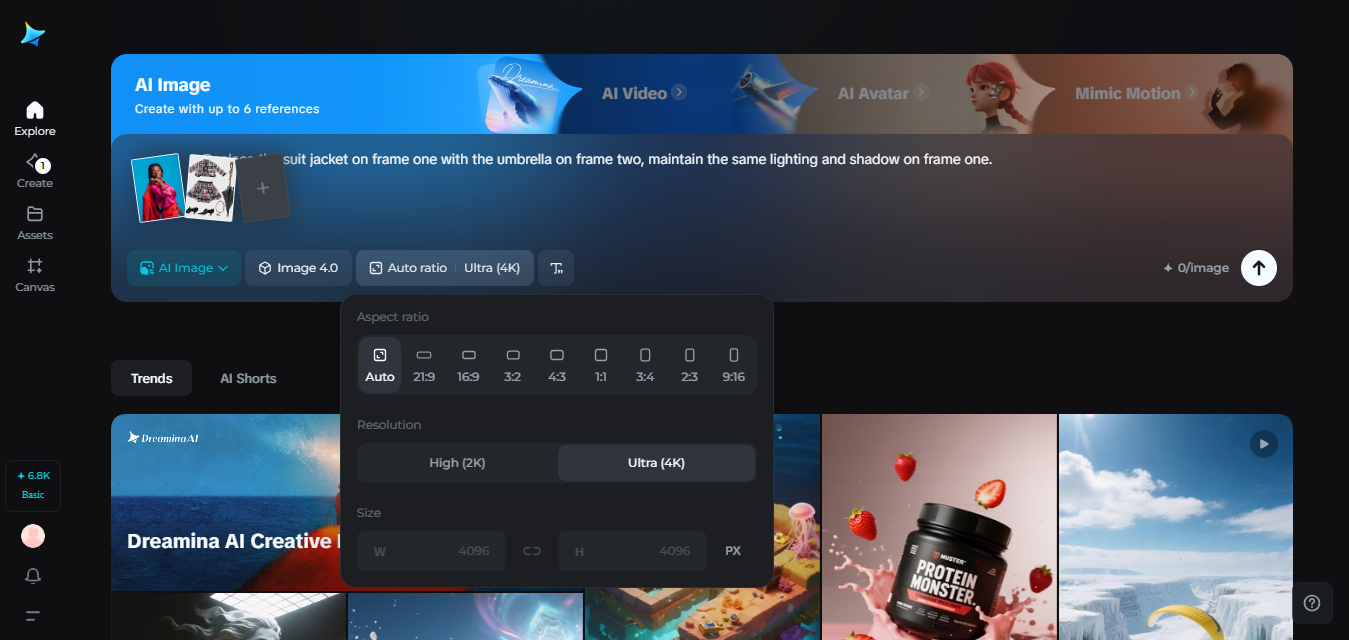 After uploading and writing your prompt, it's time to adjust your generation settings. Choose Image 4.0 by Seedream 4.0 model for precise image-to-image transformation. Next, click on the "Aspect ratio" button and select the perfect ratio for your photo. Once your aspect ratio has been set, select the resolution you want your images downloaded in. You can choose either "High 2K" or "Ultra 4K". Once you're done customizing, click on the generate button.