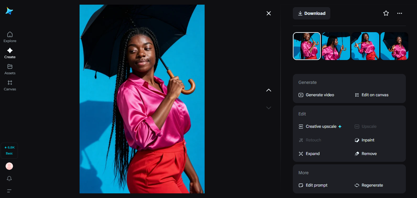 After generating, Dreamina's AI will generate 4 results for you to choose from. If there are more things to do before you download, click on the image you want, then "Edit on canvas" to fine-tune your image further. Once you're done, click the download button on the top right. Your image will instantly download and save to your device.