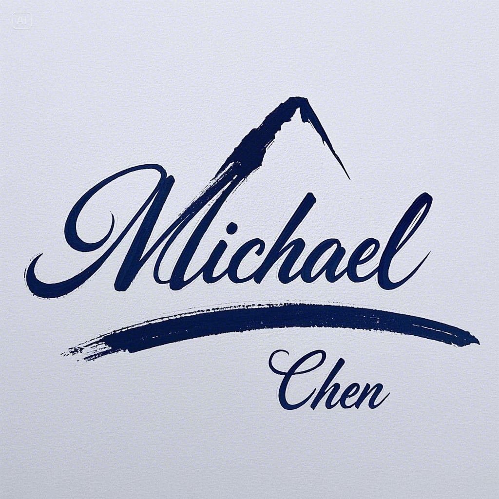 Prompt: Create a personalized signature for "Michael Chen" where the "M" gracefully transforms into a mountain peak symbol. Use navy blue ink with a slight rightward slant, and let the final stroke of the "n" curve upward to balance the design. Add a subtle shadow effect for depth.