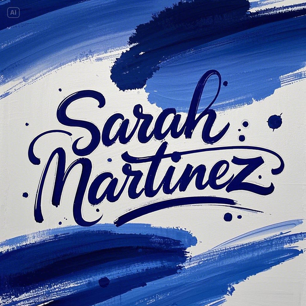 Prompt: Generate a bold, handwritten signature for "Sarah Martinez" using dynamic brush strokes in deep indigo blue. Make the letters flow together with varying pressure points, creating thick and thin lines. Add subtle paint texture and small splashes around the edges.