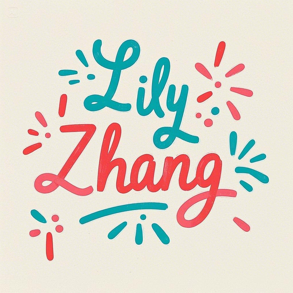 Prompt: Create a playful signature for "Lily Zhang" with rounded letters and dotted accents. Use cheerful coral pink for the main strokes and teal blue for the dots. Make the letters bounce slightly above the baseline with gentle curves and playful connections.
