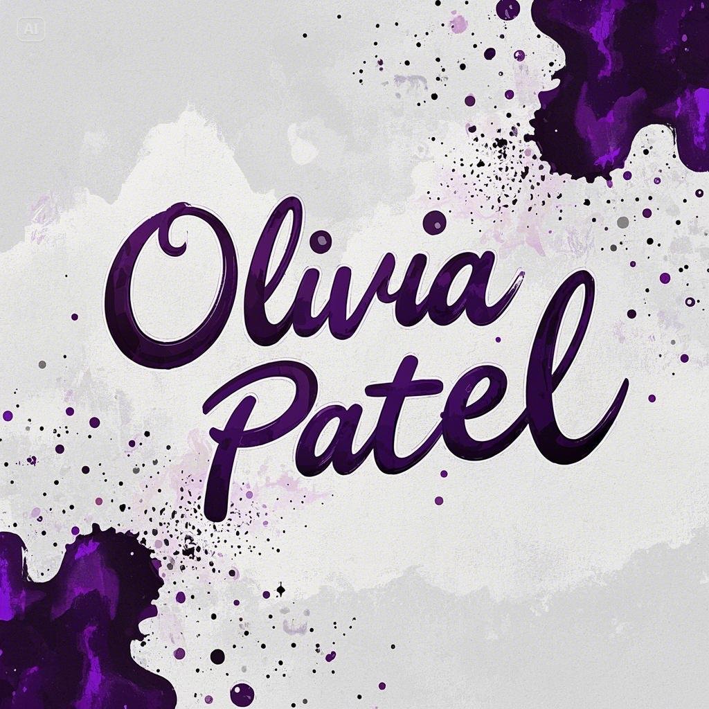 Prompt: "Design a handwritten signature for "Olivia Patel" with abstract ink splashes in deep purple. Let the letters flow naturally while surrounded by dynamic ink splatters and mists. Add varying opacity levels to create depth and movement throughout the design."