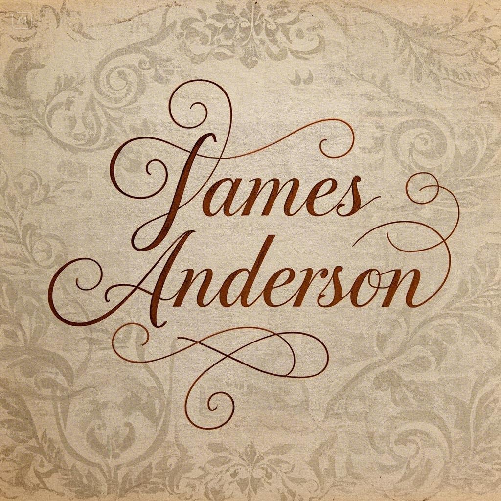Prompt: Create an ornate Copperplate calligraphy signature for "James Anderson" with balanced flourishes throughout. Main decorative swirls should flow from both "J" and "A", with delicate connecting hairlines and even spacing. Render in dark sepia on aged parchment.
