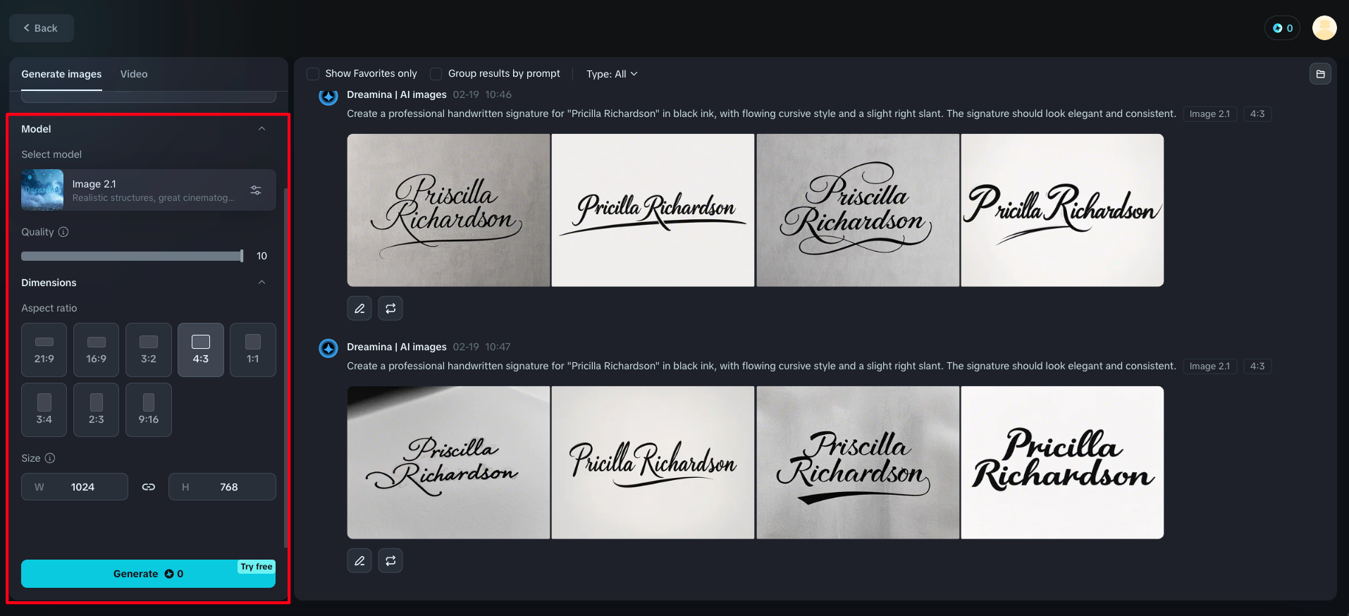 Choose your preferred model (any style model works well for signatures), set the quality to a maximum (10) for the best results, and select a square aspect ratio (1:1) or rectangle one (4:3) for optimal signature composition. Click "Generate" and watch as Dreamina creates four signature options for you to choose from.