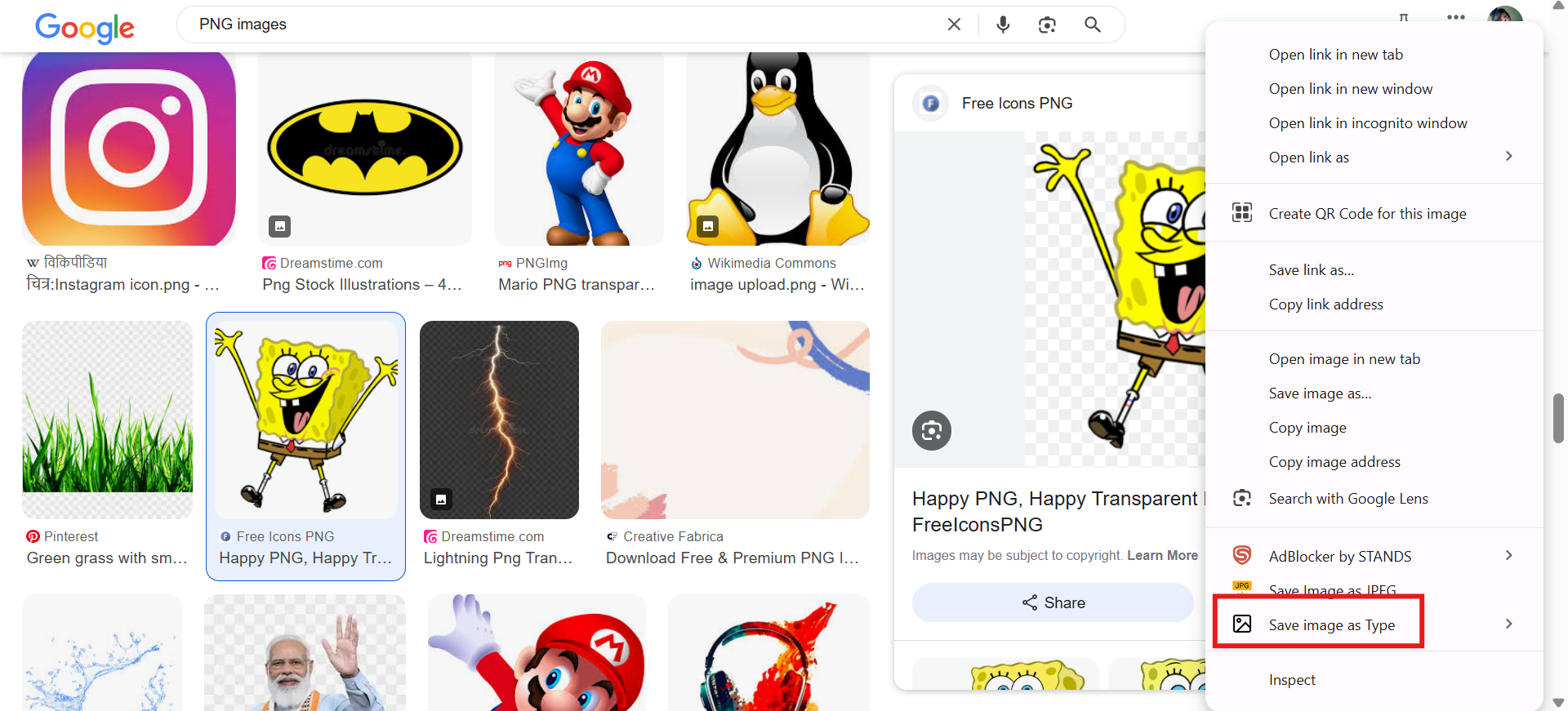 Convert PNG to JPEG free with Google extensions, such as Save Image as Type. It provides you with the easiest way to convert your images without putting in much effort or without downloading or signing up. Just add the extension to your browser, and you are ready to go. This handy "Save Image as Type solution adds a convenient option to your right-click context menu, allowing you to save images in your preferred format without extra steps.