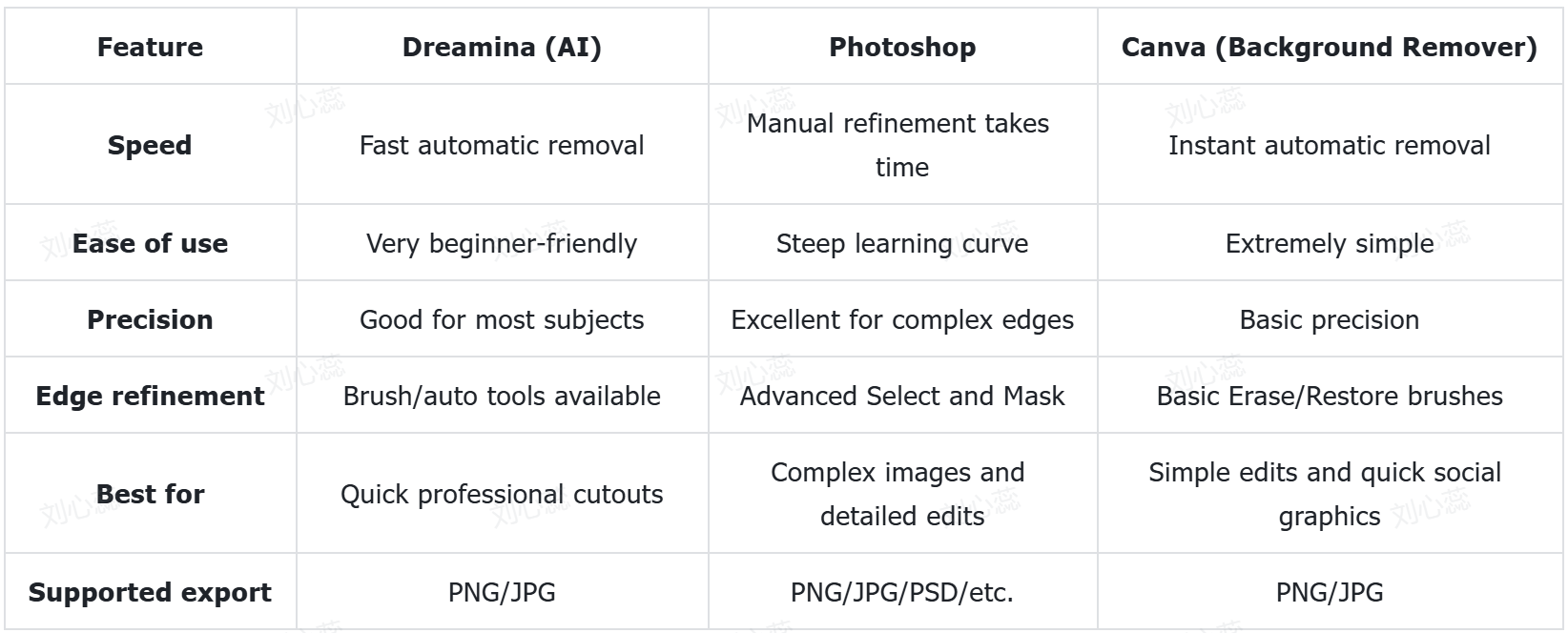Here's a comparison of the three methods — Dreamina, Photoshop, and Canva — to help you choose the most suitable option: