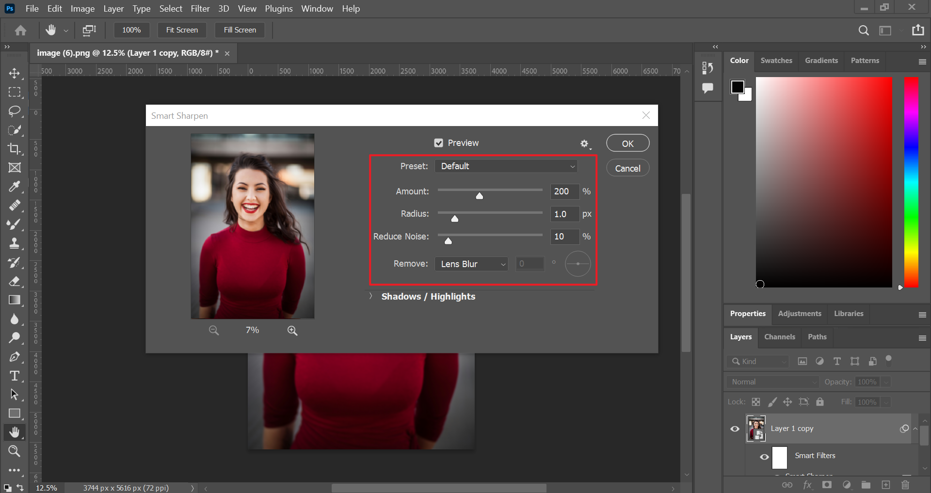 Smart Sharpen is Photoshop's most versatile sharpening tool, offering precise control over edge detection and noise reduction. It's particularly effective for photos with fine details or when you need to counteract specific types of blur, like motion or lens blur. Let's walk through how to use it effectively.