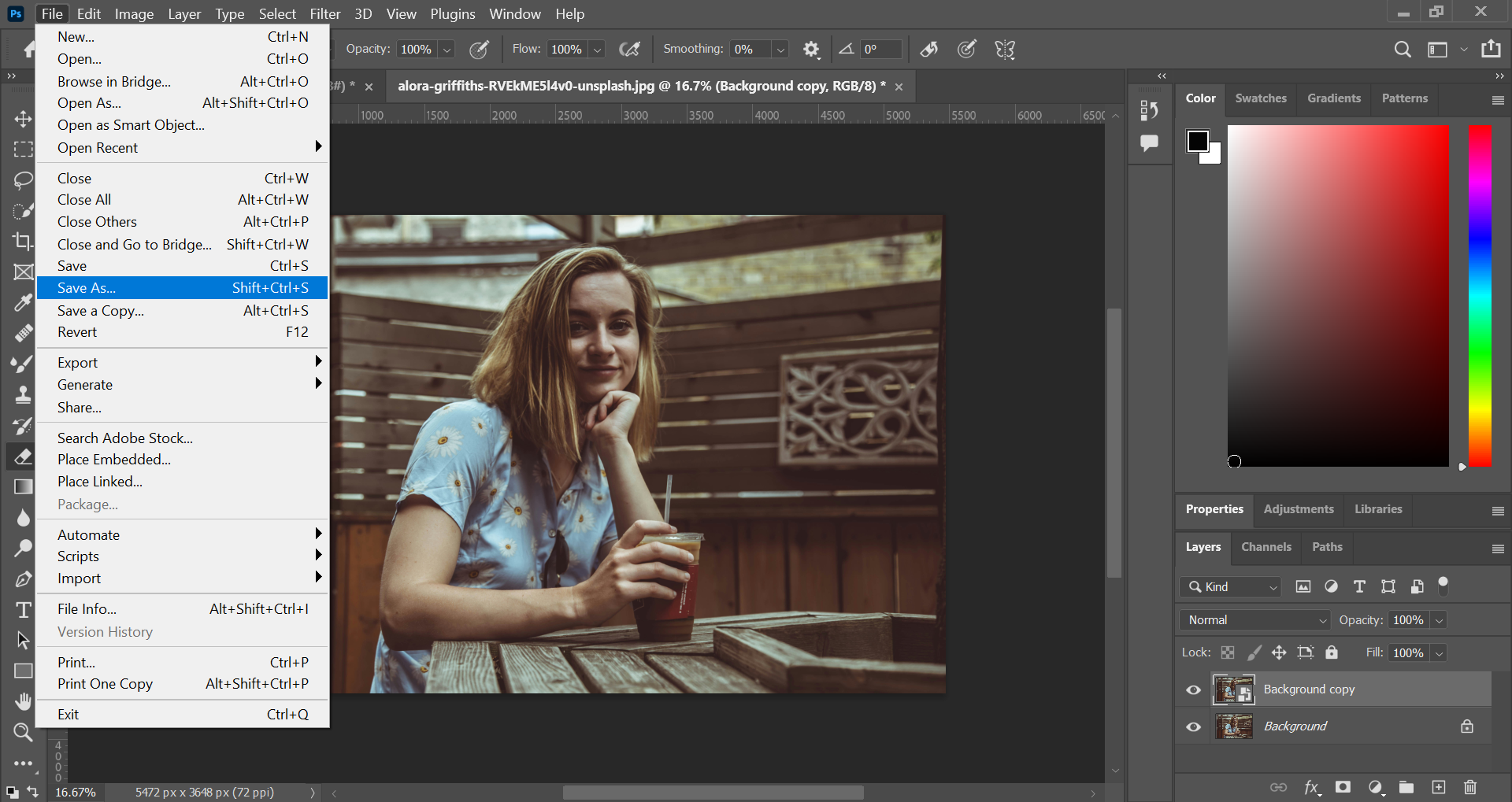Start by opening your image in Photoshop. Create a duplicate layer (Ctrl/Cmd + J), then convert it to a Smart Object. Navigate to Filter > Camera Raw Filter in the top menu.