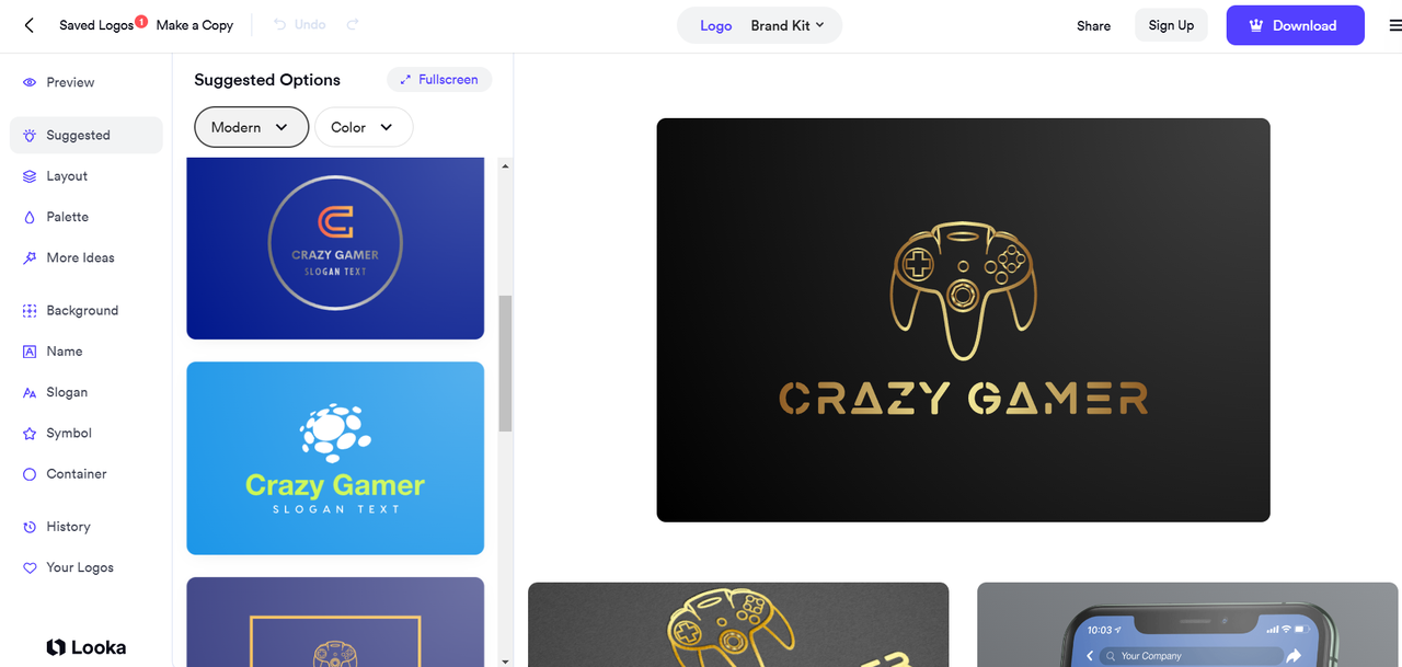 - Mockup previews: Looka's preview tool enables you to visualize your logo in real-world applications, such as business cards, merchandise, and social media profiles. This feature helps you assess the logo's impact across various platforms before finalizing your design. 4