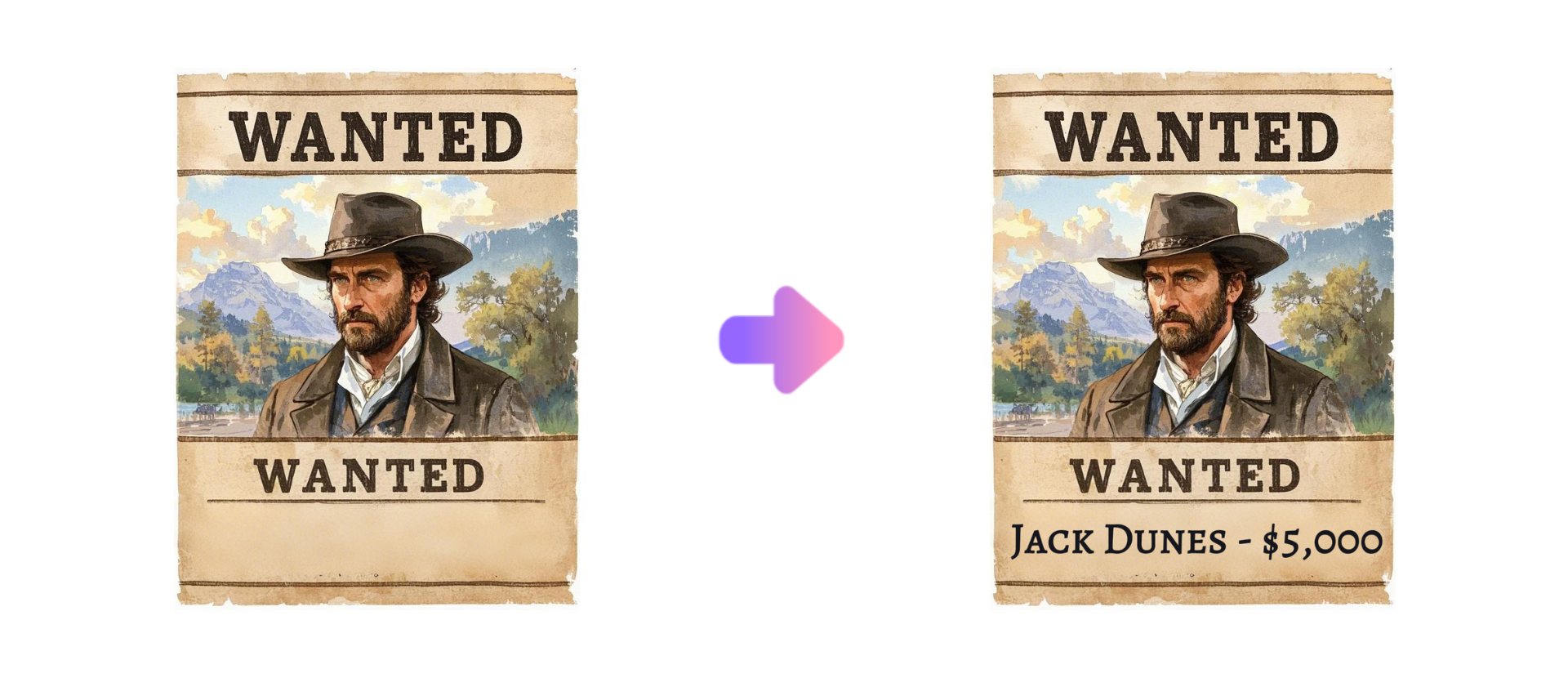 "Inpaint" lets you erase flaws and fill in gaps naturally. If your wanted poster has unwanted creases, AI smooths them out. Need to add a mustache or hat to match the outlaw theme? Just highlight the area, and AI will blend it seamlessly.