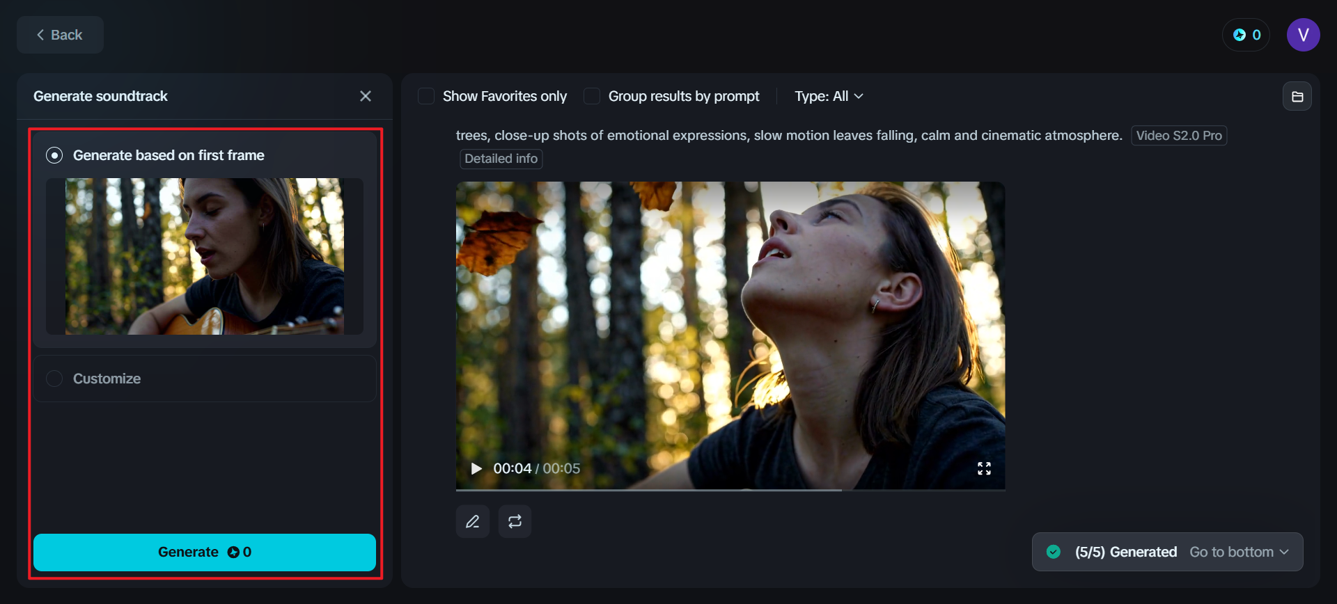 Once your video has been generated, click on it to view. To add sound, click "Generate soundtrack," then select "Generate based on first frame" to let the AI decide based on your video or choose your preferred music by clicking "Customize." Finally, hit Generate.