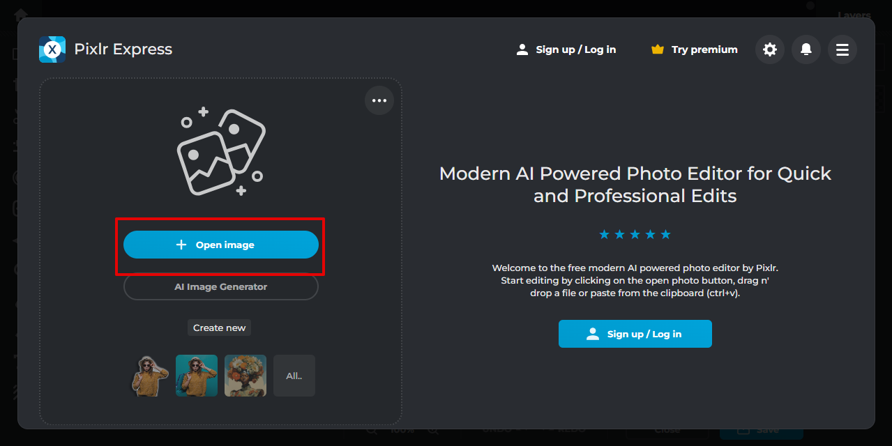 Go to Pixlr.com, select Pixlr E, sign in to your account, and click "Open AI Photo Editor." Click "Open Image" and upload the photo you want to edit.