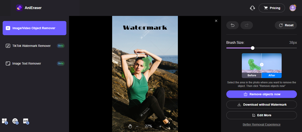 - Custom brush size: Feel free to customize the brush size to fit best with your removing area.