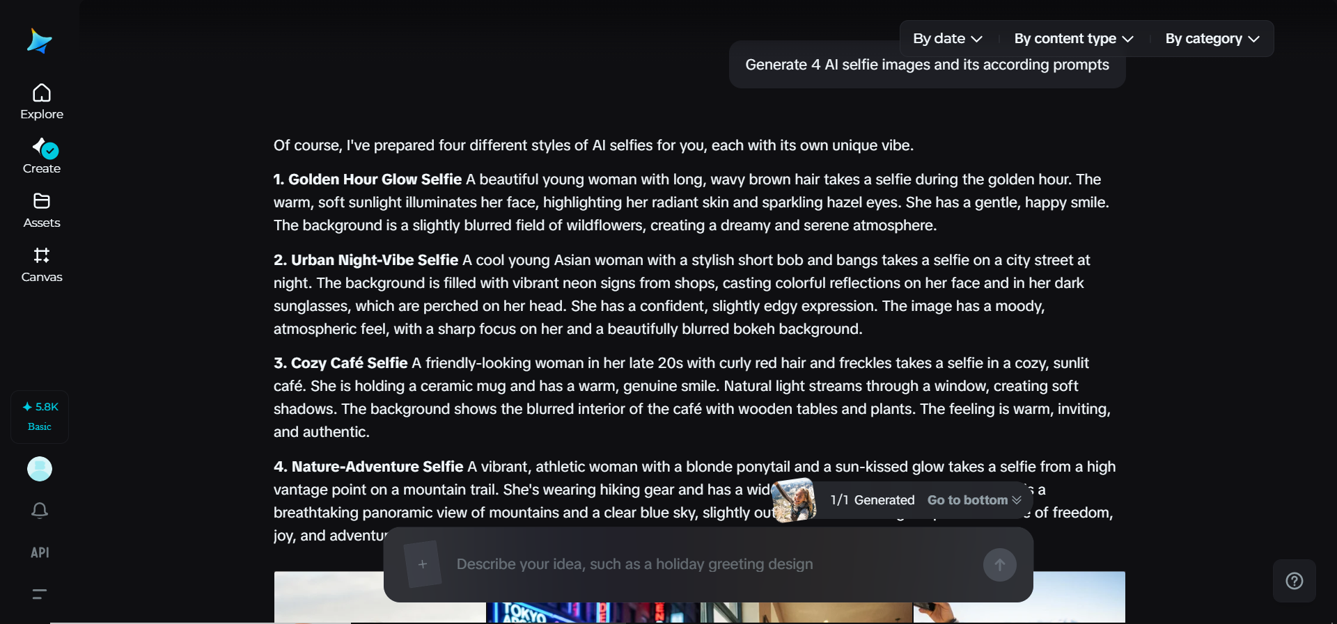 - AI Agent: With Dreamina's AI Agent, creating the perfect selfie feels effortless and natural. You describe what you want in everyday language, like brighter lighting, smoother skin, or a more confident expression, and it instantly works on your photo. It can generate multiple selfie variations at once, letting you tweak poses, try different styles, or make subtle changes without having to start over. You can create up to 40 versions in one go, making it perfect for viral TikTok clips, Instagram posts, profile picture upgrades, or any time you want several options to pick the most scroll-stopping shot.