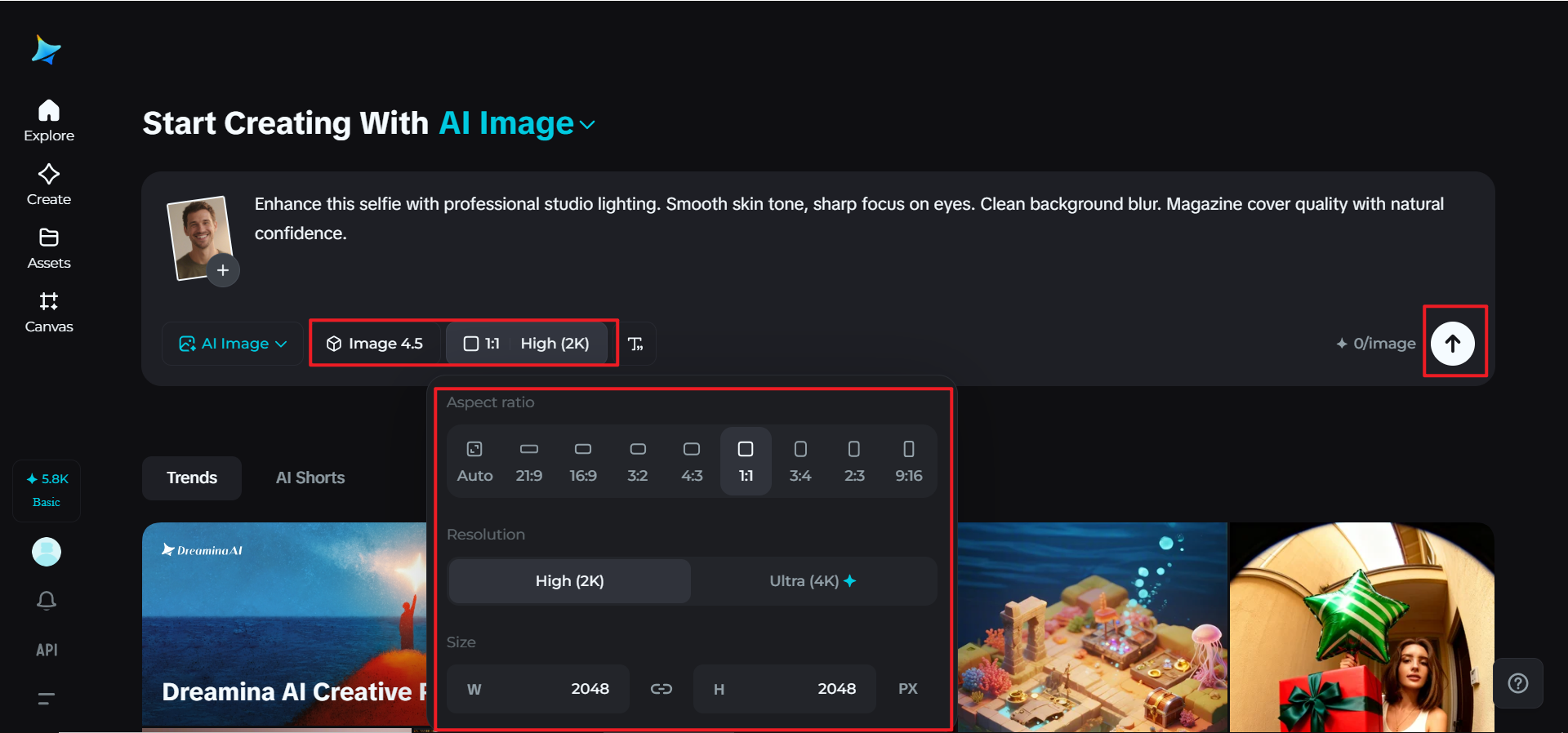 To begin, go to "AI Image" and upload your picture. For the best results, choose a clear, well-lit photo that shows your face and expression clearly. After you upload your selfie, you can write good prompts to guide Dreamina in transforming it.