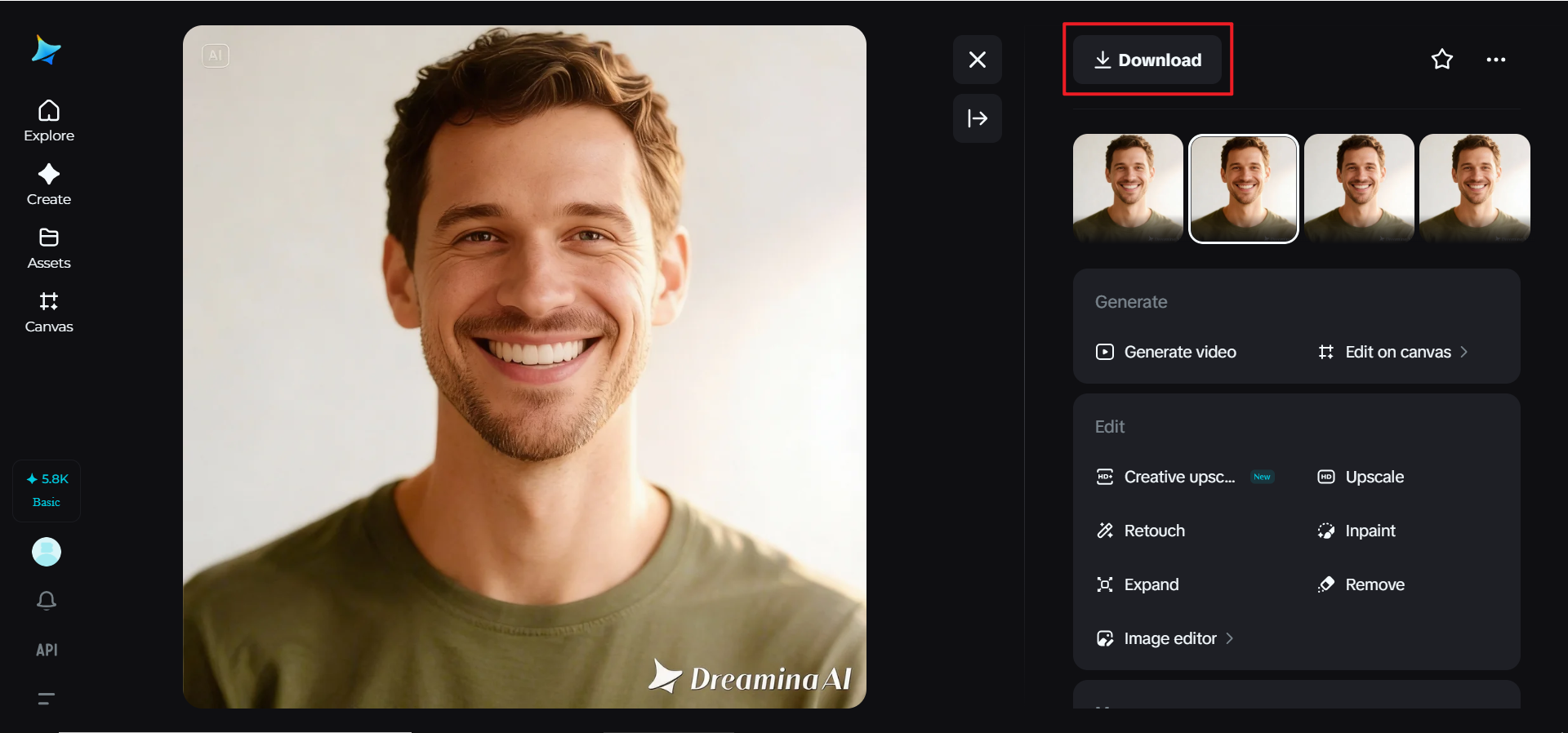 Once your selfie is generated, click "Download" to save it in high resolution. You can now share your polished, attention-grabbing photo on Instagram, TikTok, or any other social media site, use it as your profile picture, or send it to friends right away.