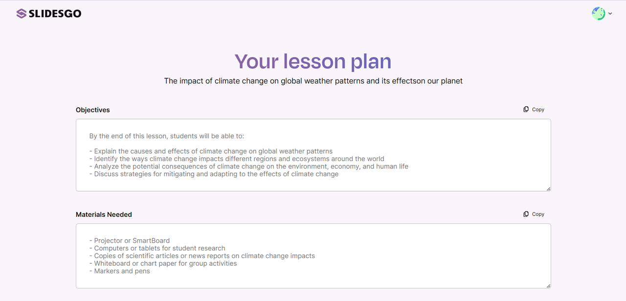 - Mahusay na pagpaplano ng aralin: Hindi na kailangang magbuhos ng napakalaking pagsisikap sa pagpaplano ng iyong susunod na aralin. Ipasok lamang ang iyong paksa, at tutulungan ka ng Silesgo na bumuo ng mga komprehensibong aktibidad sa aralin mula sa mga materyales, warm-up, at mga aktibidad ng grupo.