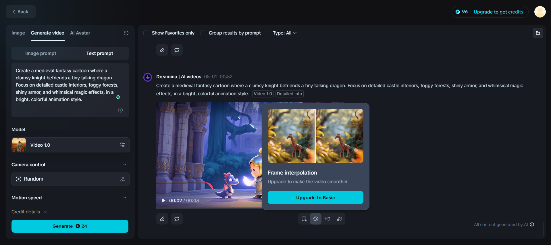 Bu harika araç, videonuzdaki mevcut kareler arasında yeni kareler oluşturarak içeriğin daha sorunsuz çalışmasını sağlar. Dreamina 'nın "Çerçeve Etkileşimi" aracı, artık onları burada otomatik olarak oluşturup birleştirebileceğiniz için, her çerçeveyi manuel olarak çizme ve oluşturma zahmetinden kurtarır. Hızlı veya anında bir eylem içeren bir sahnede sarsıntılı noktalar olabilir, ancak "Çerçeve Etkileşimi" aracı, daha gerçekçi çerçeveler ekleyerek her şeyi düzeltir.