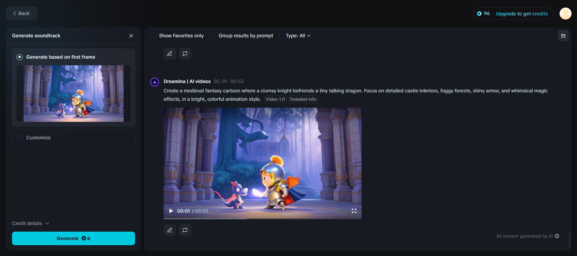 Dreamina 'nın "Generate Soundtrack" aracı, çizgi film içeriğinizin tonunu ve hızını gözlemler ve o sahneye sığacak sesleri analiz eder. Dreamina 'nın yapay zeka otomatik teknolojisi, videonuzun hikayesini, hüzünlü sahneleri, iyimser anları fark eder ve şimdi "Soundtrack Oluştur" aracıyla, dramatik, maceracı veya neşeli olsun, eşleşen arka plan seslerini tanıtarak çizgi film deneyimini geliştirebilirsiniz.