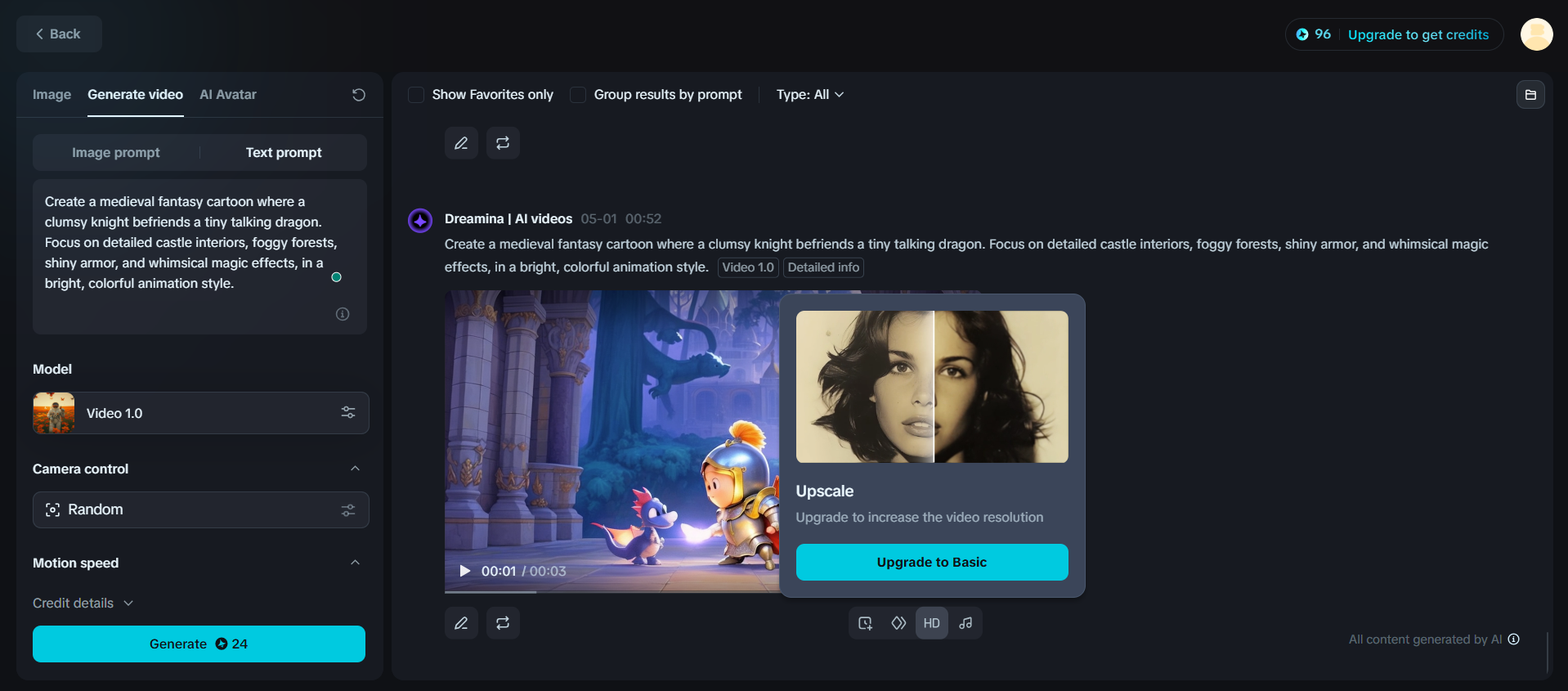 Dreamina 'nın "HD Lüks" aracı, düşük çözünürlüklü çizgi film filmlerini canlı, gişe rekorları kıran çizgi film filmlerine dönüştürerek güçlü bir kalite artışı olarak çalışır. "HD Lüks" aracıyla, video içeriğinizin tüm bulanıklığını temizleyebilir, kenarları keskinleştirebilir ve nihai sonucunu parlatabilirsiniz. Dreamina ile sıkıcı çizgi film filmlerinizi görsel olarak çekici içeriğe dönüştürün.