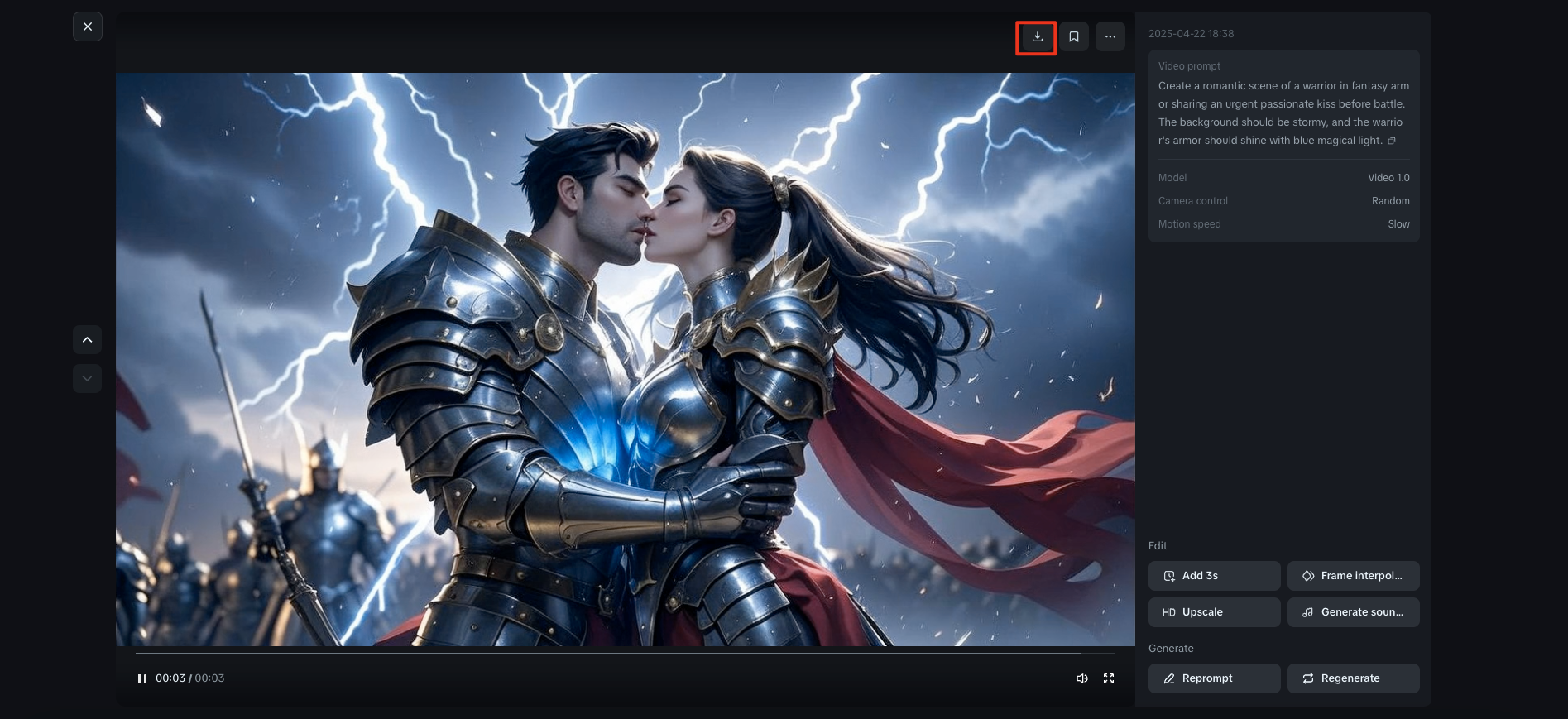 Yaklaşık 30-40 saniye işlendikten sonra Dreamina, yapay zeka tarafından oluşturulan öpüşme videonuzu sunacak. Sonucu gözden geçirmek için üzerine tıklayın; Memnun kaldıysanız, cihazınıza kaydetmek için sağ üst köşedeki İndir düğmesine tıklayın.